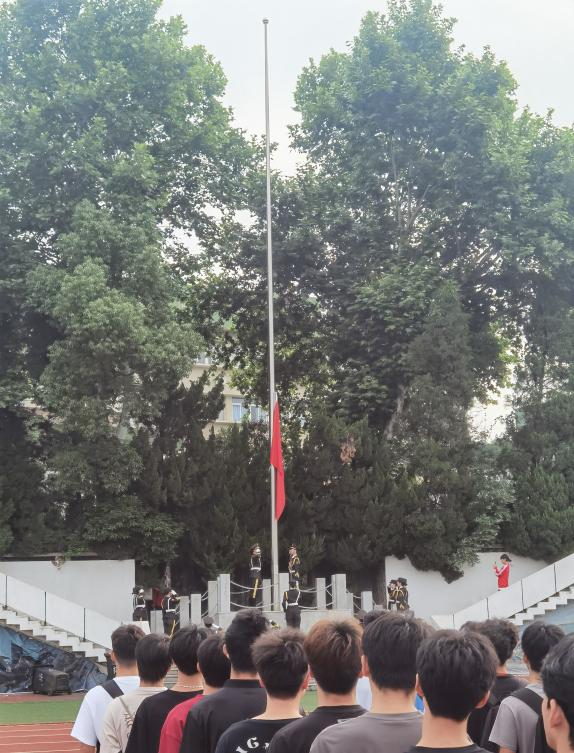 仪式伊始,全体师生面向升旗台整齐列队。在指挥员的口令下,英姿勃发的国旗护卫队队员列队向升旗台走来。坚毅果敢的步伐,气宇轩昂的军姿震撼人心。随着“升国旗、奏唱国歌”的口令响起,在雄壮的国歌声中,鲜艳的五星红旗冉冉升起,迎风飘扬。全体师生面向国旗庄严敬礼、高唱国歌,表达对祖国的赤诚热爱,祝福伟大祖国繁荣昌盛。