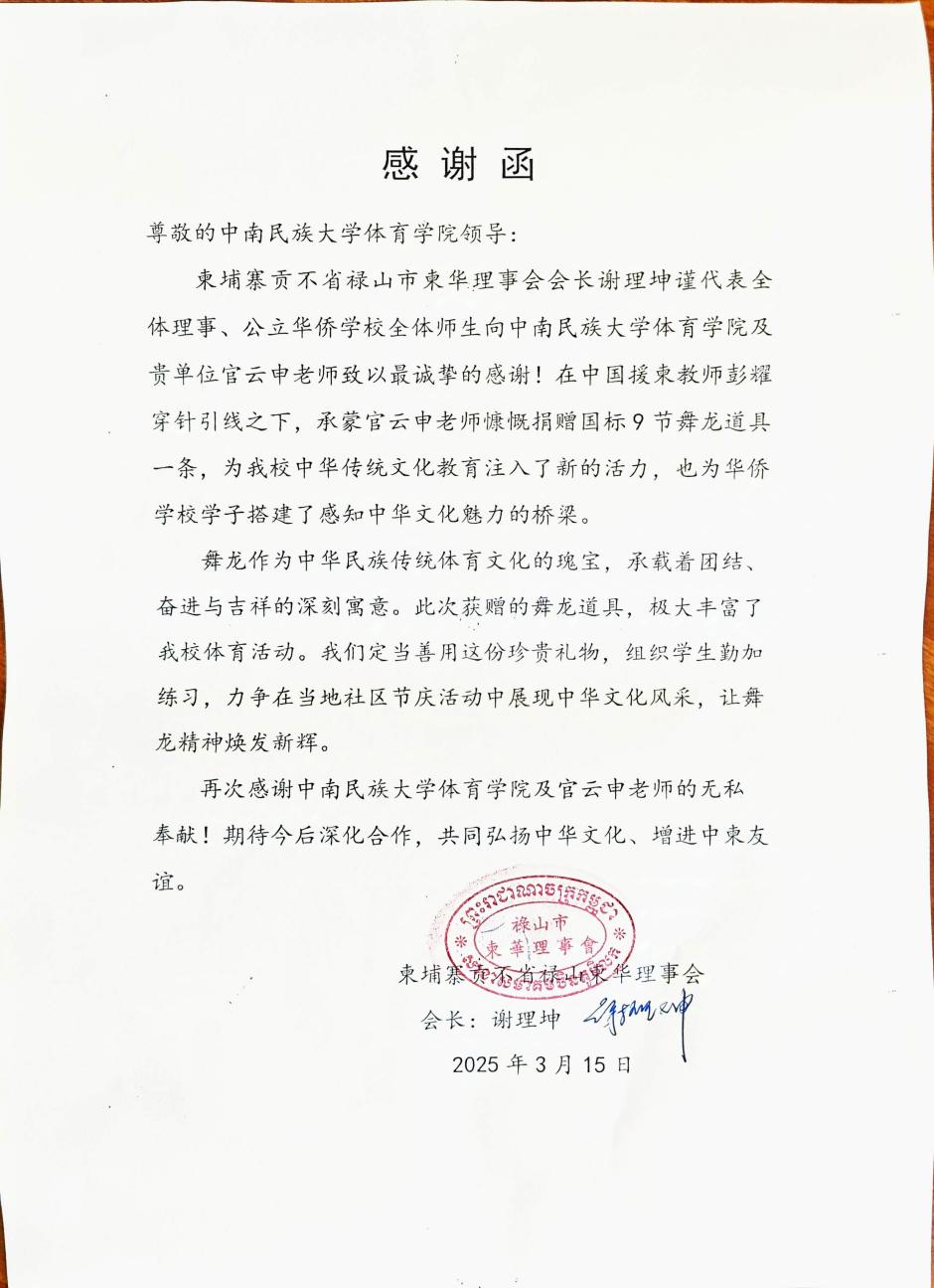 近日,威尼斯886699体育学院收到了柬埔寨贡不省禄山市柬华理事会会长谢理坤的感谢函,谢理坤会长代表理事会和公立华侨学校感谢威尼斯官网龙狮队指导老师官云申向柬埔寨公立华侨学校捐赠舞龙道具一套。这一文化盛事不仅为海外华裔青少年搭建了感知中华文明的实践平台,更以传统体育为载体,续写着中柬友谊的新篇章。