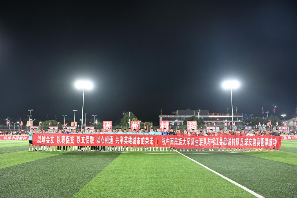 在足球文化交流环节,师生联队先后与巴西银河联队、榕江“村超”冠军忠诚村队进行友谊赛。比赛中悬挂的“以球会友、以赛促交、以文促融、以心相通”横幅,凸显了交流主题。面对强劲对手,师生联队展现出团结拼搏的精神,赛后双方友好互动,生动体现了体育促进交往交流交融的价值。
