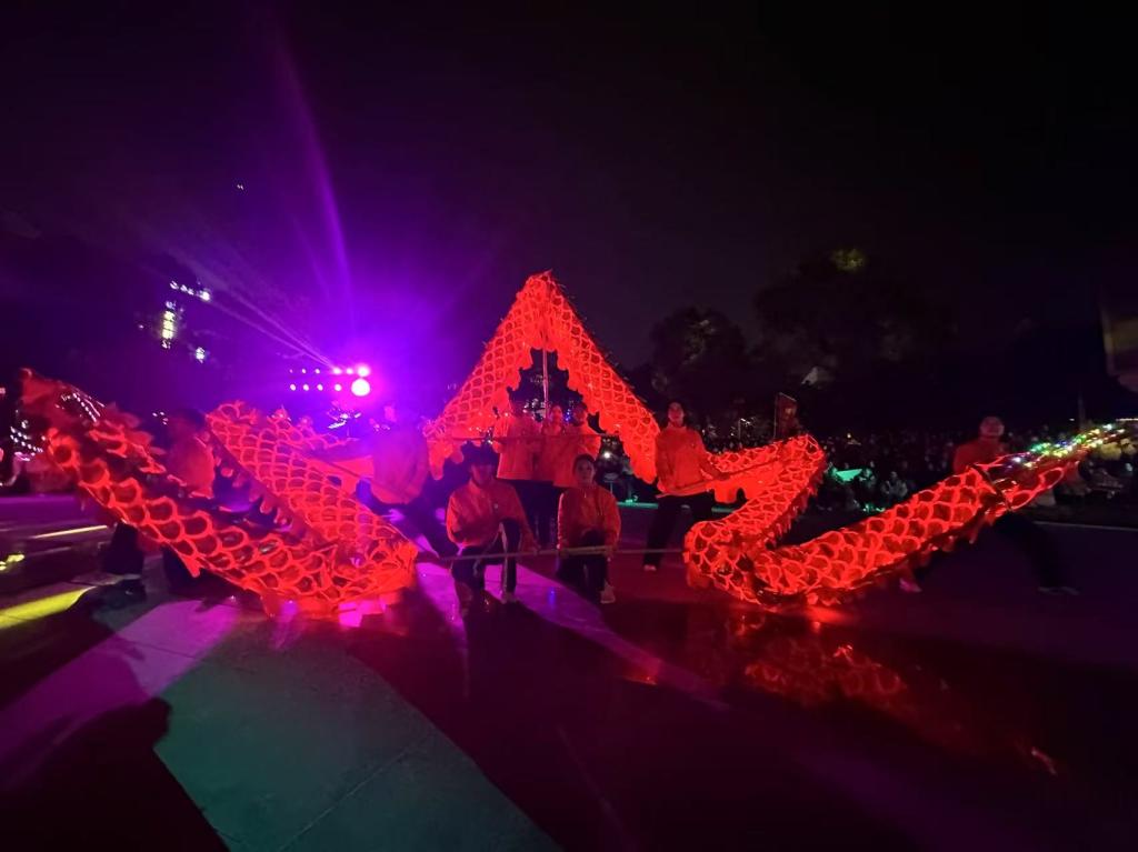 灯会现场,两条彩龙在鼓乐声中灵动起舞,多民族队员配合默契,腾跃翻滚间展现龙的雄健神韵,更传递出各民族携手并进的磅礴力量。表演中,多民族文化元素的巧妙融合,让现场各族群众深切感受到中华民族共同体的精神纽带,掌声与喝彩声此起彼伏,成为民族团结的生动写照。