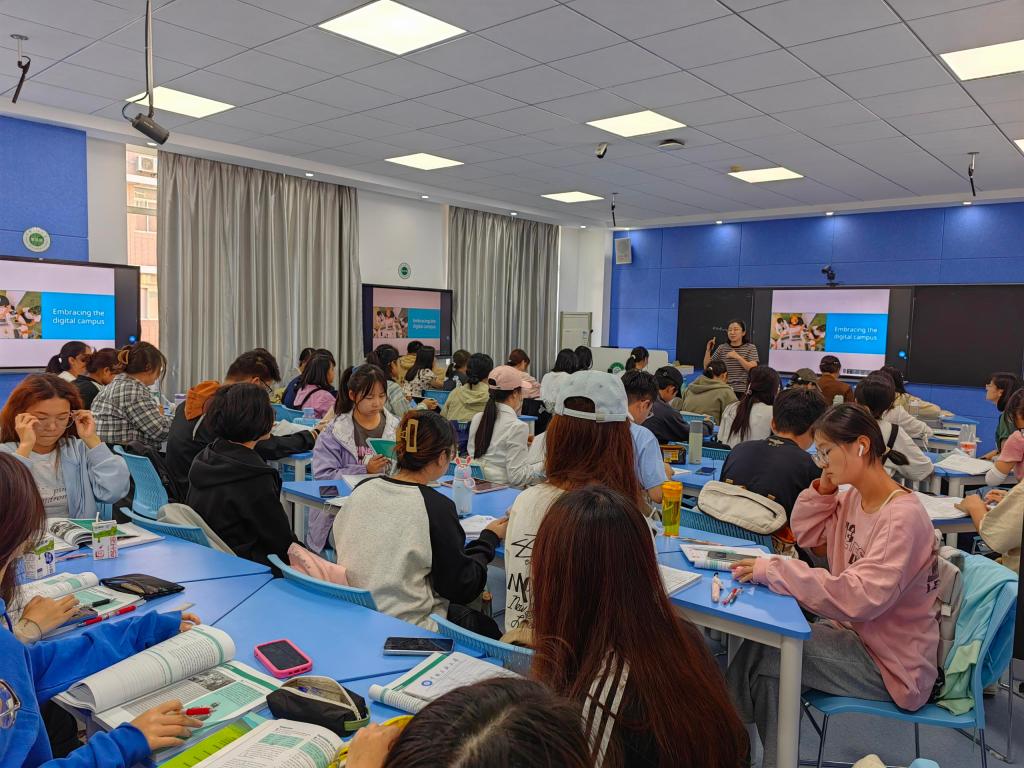 涂艳丽老师的授课内容为《新视野大学英语1》 Unit 3 Digital Campus的导入部分,我院共有14位老师观摩该课堂。通过引入学生熟悉的手机应用和学习平台的话题,引导学生探讨数字校园如何帮助师生高效学习和生活。学生们通过分享自己的经验和见解,总结了数字校园的优势和作用。涂艳丽老师还通过辩论的方式,鼓励学生探讨数字校园带来的好处和挑战,强调平衡和充分利用数字校园带来的机遇与挑战的重要性。