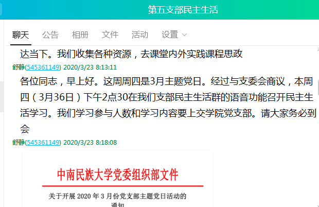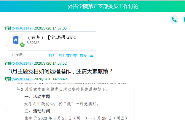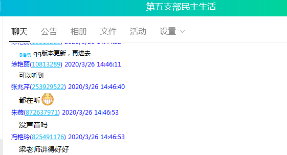 3月26日下午2点30分,外语学院教工第五支部15位党员同志们准时在QQ群以语音会议的形式进行了远程实时主题党日活动(曾素英同志因侄子骨折,送孩子看医生,请假)。党员同志们通过网络平台和学习强国APP认真学习了习近平总书记在抗疫期间的5次讲话和1次回信后,十几位同志在讨论会上踊跃发言,会后撰写书面学习体会。