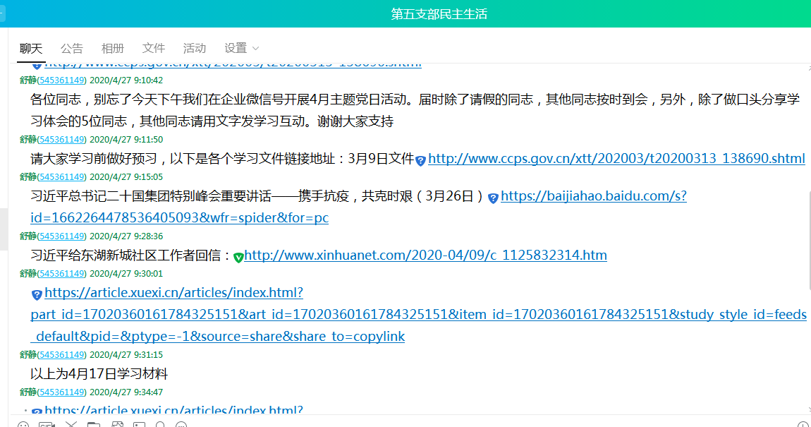 2020年4月27日下午2点30分,外语学院第五支部通过企业微信号工作群召开4月主题党日活动,活动由支部书记舒静主持,除了李勋同志因事请假,其他党员同志准时加入会议。