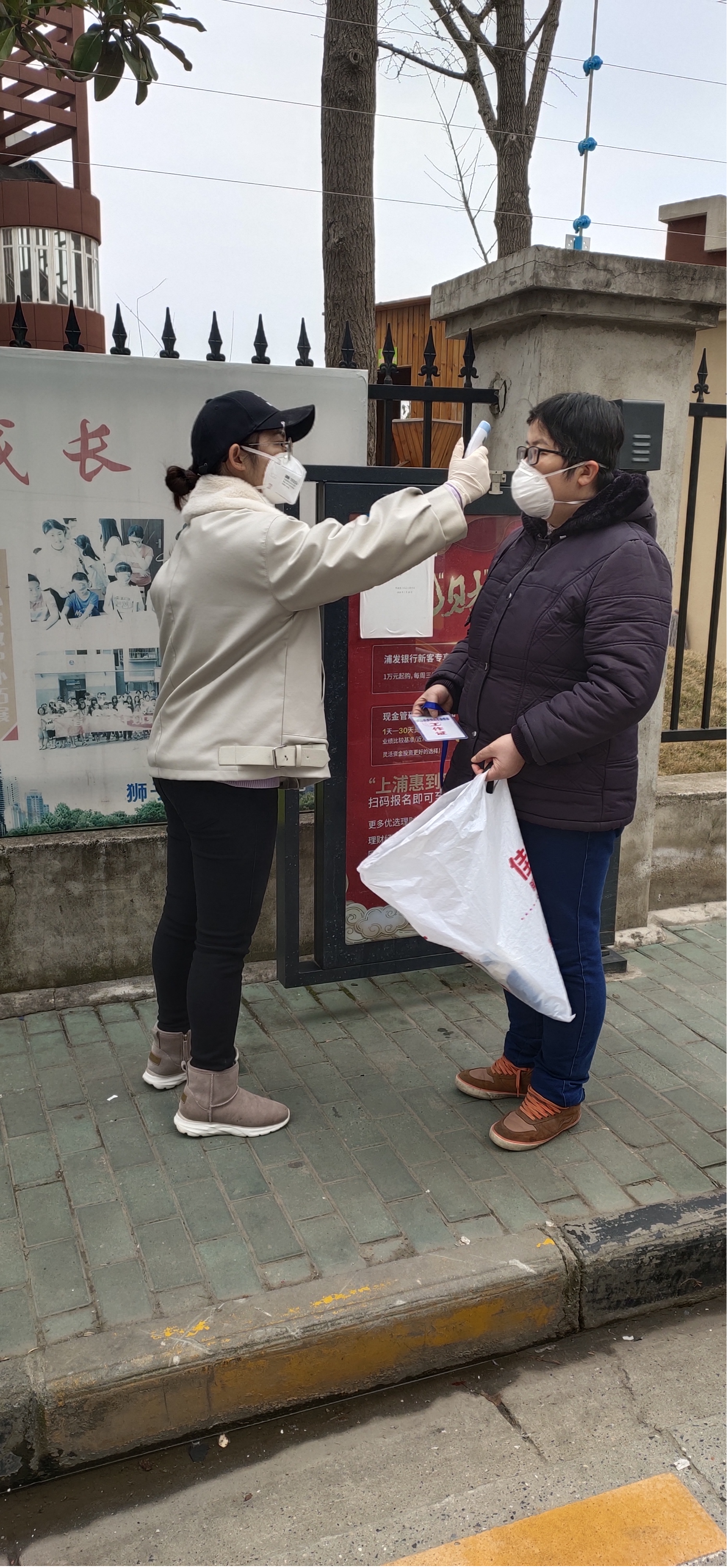 陈骊姗老师在为进出小区住户量体温 陈骊姗逐户上门排查发热情况