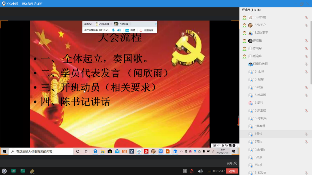国歌演奏过后,预备党员代表闻欣雨进行发言,她回顾了自己从积极分子到预备党员的心路历程,随着对党的理论知识不断深入学习,意识到作为预备党员的我们更要以身作则,坚定信念。在这一次抗击疫情的战争中,更是再一次真切感受到了党的独特性与先进性。她提到,作为新时代大学生的我们,要不断加强自己的理论知识学习,增强党性修养,努力完成党的各种考验。要用专业的、过硬的本领回应挑战,担当时代使命。最后,闻欣雨同学代表全体预备党员向党组织的教育和培养表示衷心的感谢,并预祝大家在本次培训班中学有所得、学有所悟、学有所用。之后,刘甜甜老师进行了开班动员,培训班的网络教学安排和考核做了相关介绍与说明同时,老师向同学们提出两点要求,第一,思想上高度重视,增强党性意识,纪律意识。第二,行动上积极主动认真学习,增强自觉性。