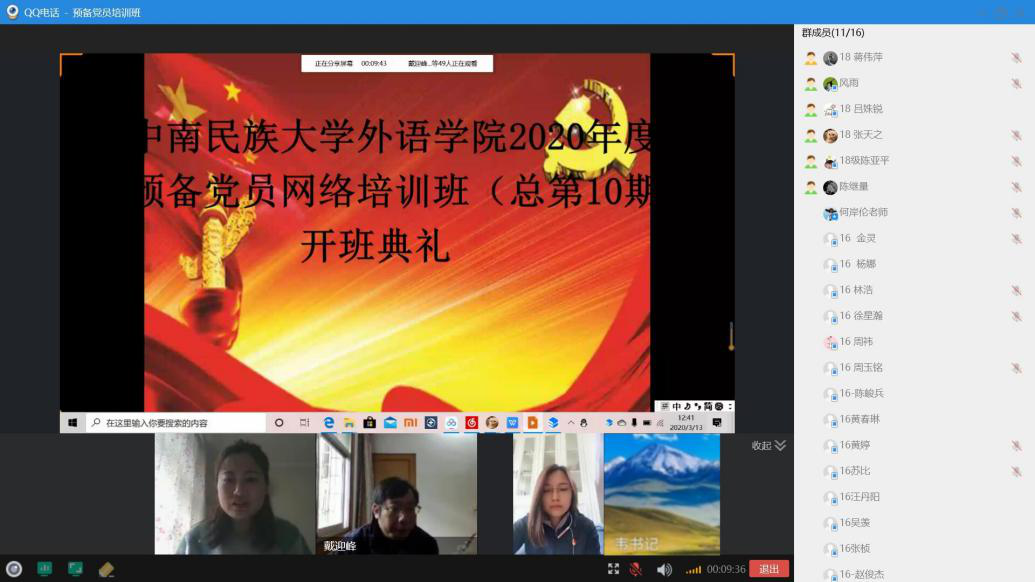 为深入贯彻落实国家民委党组和学校新冠病毒疫情防控工作精神,按照学校党校的相关要求,做好预备党员培训工作,我院于313中午召开外语学院2020年度预备党员网络培训班线上开班典礼。我院党委书记戴迎峰、党委组织员韦应忠、党委副书记陈晓希、团委书记兼2016级辅导员陈继量、团委副书记兼2017级辅导员何岸伦2018级辅导员兼培训班班主任刘甜甜出席了本次开班典礼开班典礼由刘甜甜主持,全体预备党员参加本次开班典礼。