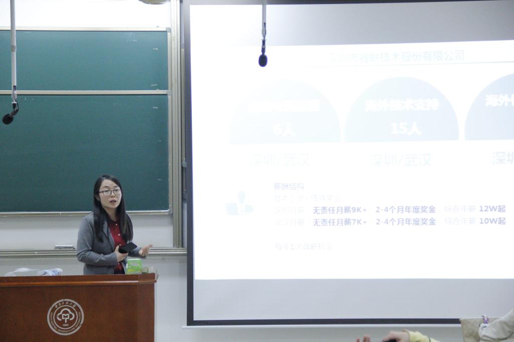 各单位宣讲人依次介绍自身行业优势、职位需求和就业福利。武汉环球英语学校教学总监吕艺丹详细介绍环球教育品牌及工作环境、职工待遇、应聘流程,并表达对同学们积极应聘英语教师一职的期盼。