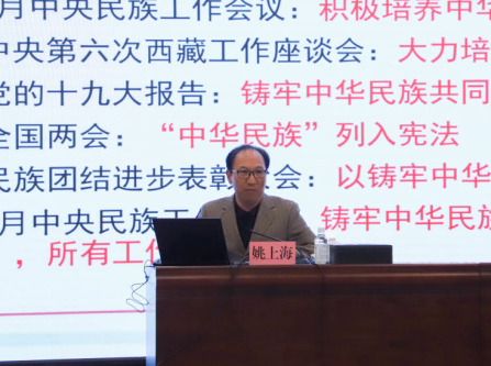 姚上海表示,“铸牢中华民族共同体意识是我们党着眼长远,巩固和发展民族团结,实现中华民族伟大复兴的重大要求和部署。”他强调,要从党的百年民族工作中汲取宝贵经验,以民族工作的“八个坚持”、“九个铭记”、“十二个必须”作为我们教学、科研、管理等各方面工作的根本遵循和行动指南,为推动民族工作提质增效和高质量发展不懈奋斗。