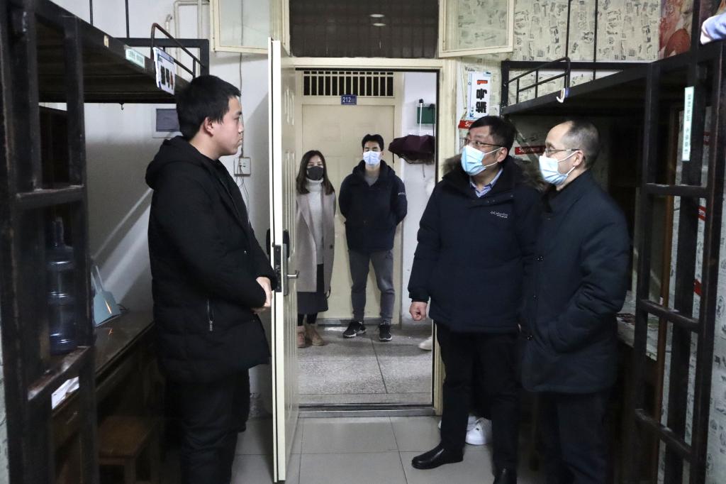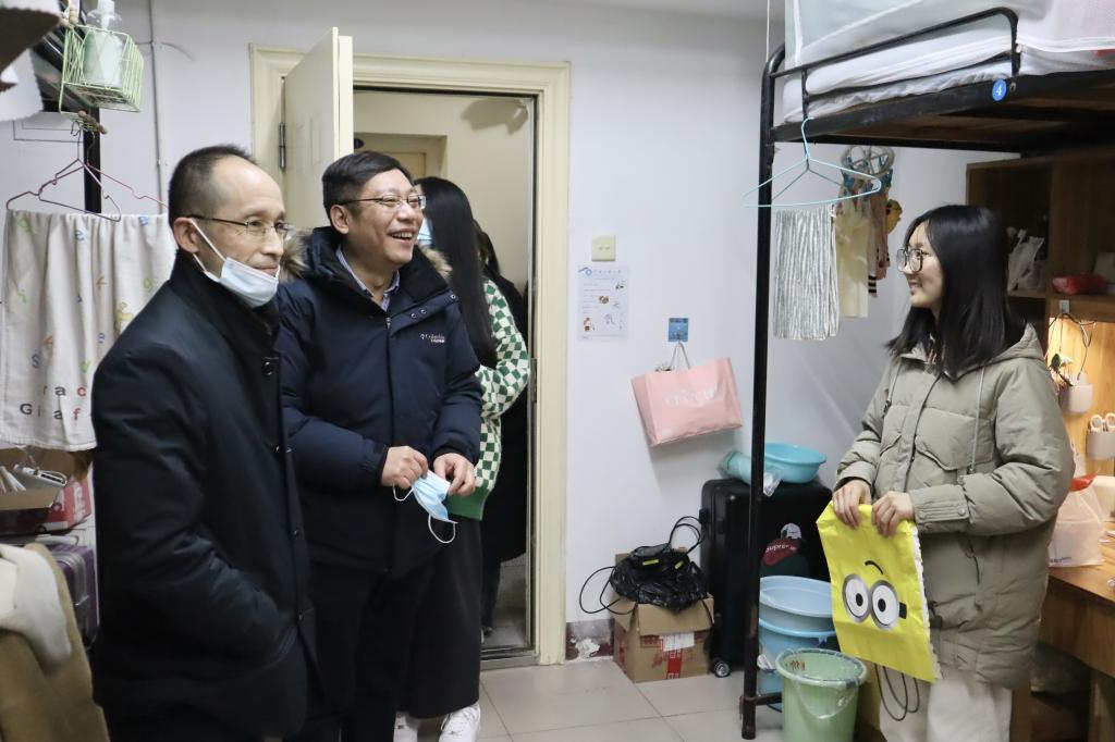 2月21日开学第一天晚,党委书记戴迎峰及党委副书记、院长易立新率全体班子成员和教师代表前往学生宿舍进行走访。