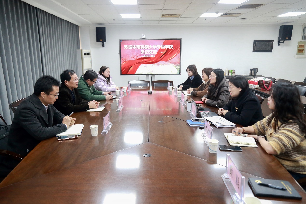 3月5日上午,院党委书记李春雷一行来到华中科技大学外国语学院,就党建引领、学生思想政治教育、学风建设、就业指导等方面的先进经验进行调研学习。华中科技大学外国语学院党委书记王小月、党委副书记胡祎等热情接待了来访一行,并进行了深入交流。