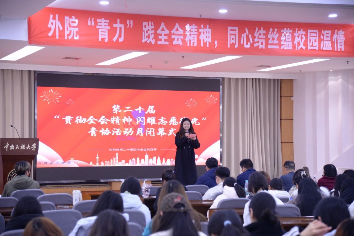 12月18日晚,外语学院青年志愿者协会在润良报告厅圆满举行第二十届青协活动月闭幕式。学院2025级辅导员董津佐、2025级各班班导师、青协全体志愿者及新生代表齐聚一堂,共同回顾活动历程,见证志愿服务的丰硕成果。