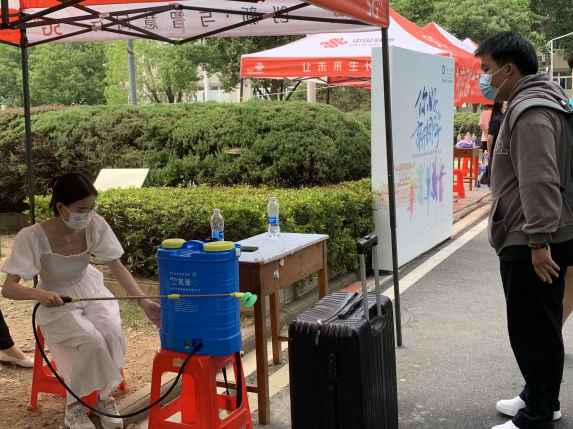 (入校第一步:行李消杀。 彭娣摄) (用拖车转运大件行李。彭娣摄)
