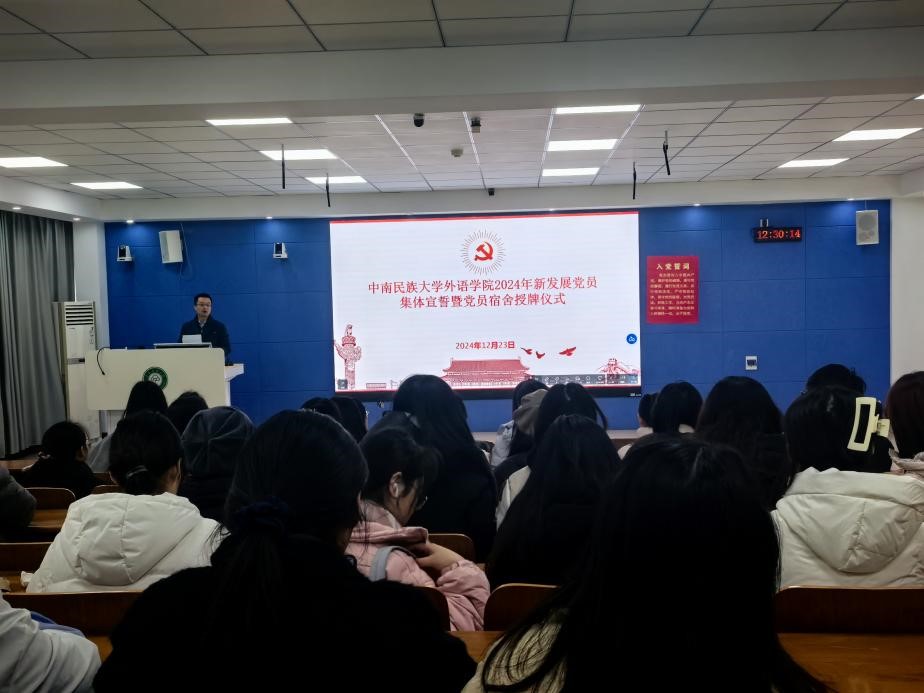 仪式在庄严的《中华人民共和国国歌》声中拉开序幕,全体与会成员起立奏唱国歌。随后,姬扬宣读了党委审核通过的新一批预备党员名单,正式欢迎33名新发展党员加入党的队伍。预备党员代表孙宇涵发言,号召全体新党员以党员标准严格要求自己,发挥先锋作用,带动身边同学共同成长进步。王斌组织全体参会的新老党员在党旗下重温了入党誓词。宣誓仪式结束后,进行党员宿舍授牌仪式,李春雷和姬扬为新党员宿舍颁发“党员宿舍”标识牌。