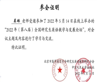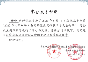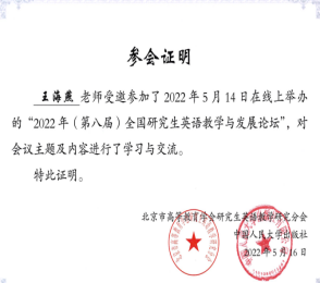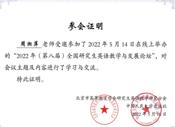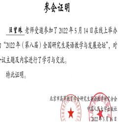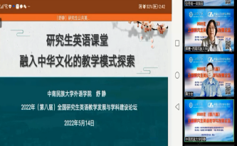2022年5月14日,研究生英语教研室老师参加“2022年(第八届)全国研究生英语教学与发展论坛”,与全国从事研究生英语教学的老师们相聚云端,交流如何响应党和国家培养创新人才的新时代要求,探索研究生公共英语的教学理念和教学模式。