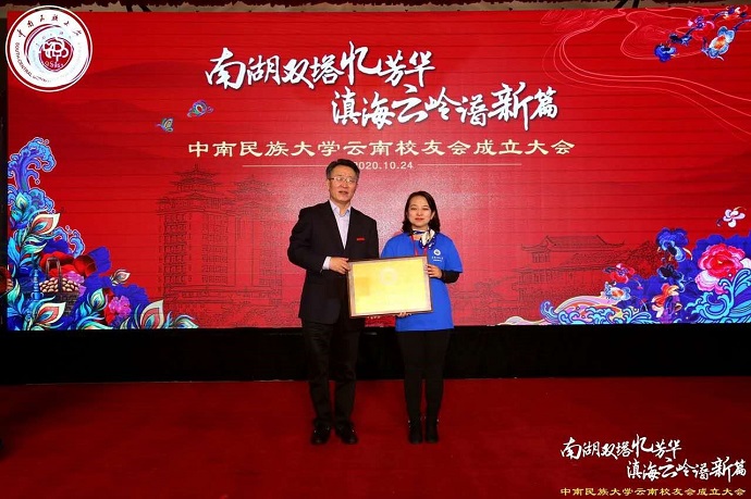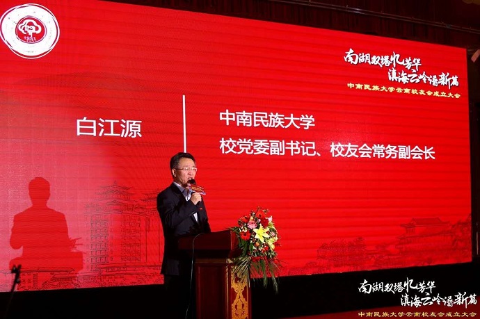 校党委副书记白江源代表学校向云南校友会的成立表示热烈地祝贺并向云南校友会赠授会牌,他对为筹备本次会议付出辛勤汗水的校友们表示衷心的感谢,向在滇全体校友致以亲切问候。他向各位校友介绍了近年来学校在人才培养、科学研究、社会服务等方面所取得成绩。并对云南校友会提出三点希望,一是坚持以服务校友为宗旨,不断加强云南校友会的自身建设。通过云南校友会的成立,为广大云南校友搭建一个更为广阔的感情交流平台、事业发展平台,信息交流平台。二是坚持以服务社会为使命,不断凝聚云南校友的聪明才智。希望云南校友会能够积极引导广大云南校友,积极投身地方发展,贡献“民大人”的智慧和力量。三是坚持以爱校兴校为共同责任,不断密切母校与校友的沟通联系。