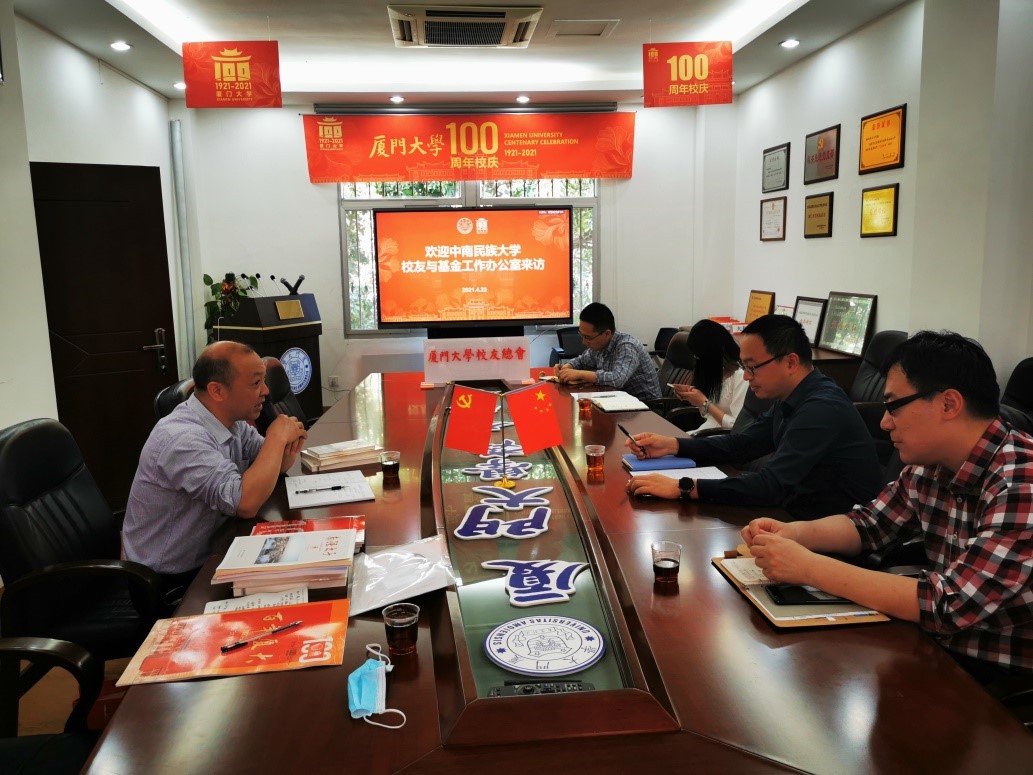 2021年4月22日上午,校友与基金工作办公室主任舒服明一行2人赴厦门大学学习交流校友及教育基金会工作。厦门大学校友总会副秘书长郑辉、教育发展基金会王学军等四位老师参加了交流会。