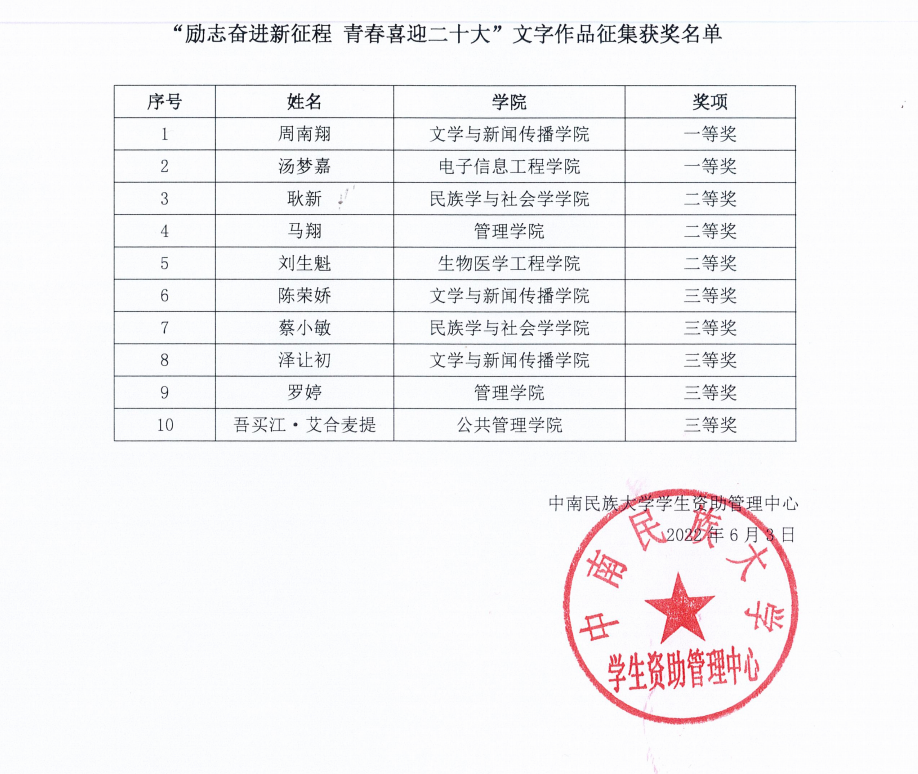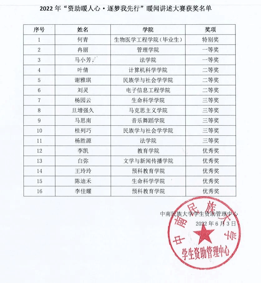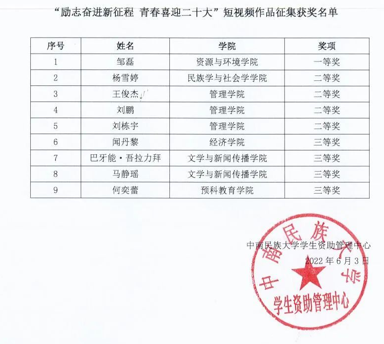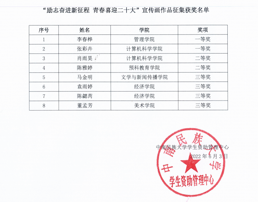 请以上获奖选手于6月7日—6月10日在工作时间(周一至周五:早上8:00-12:00 下午14:00-18:00)到大学生活动中心三楼学生资助管理中心办公室领取奖状。