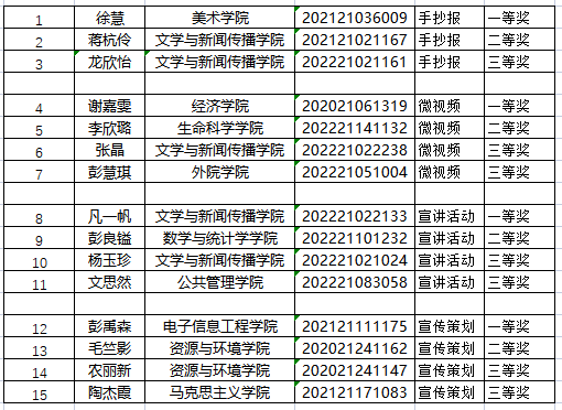 经过评委和老师的综合评定,对每项子活动的单项作品进行全面的评审,根据上交作品的质量和数量,对奖项和奖品做出了一定的调整,现将比赛结果公布如下: