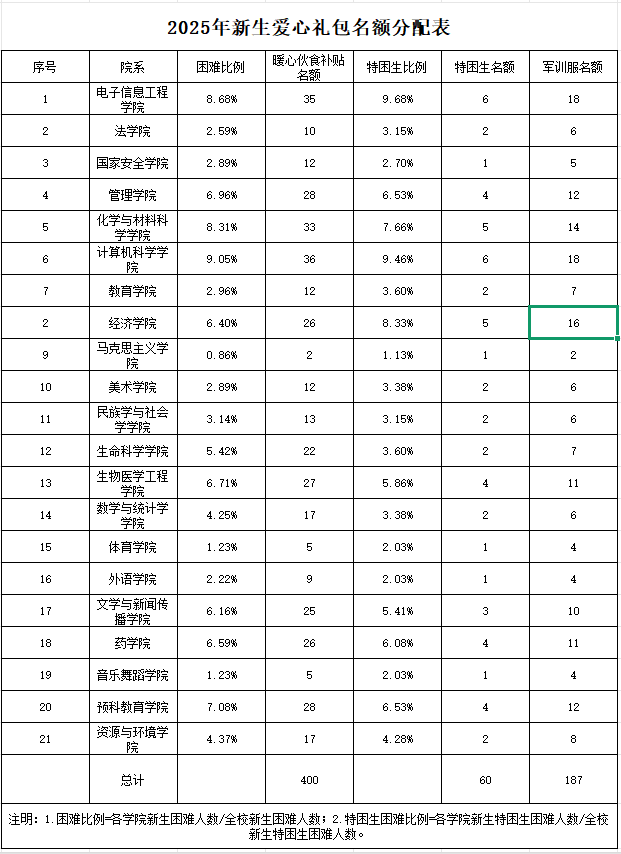 “爱心礼包”发放名额依据各学院家庭经济困难新生占全校家庭经济困难新生比例来分配,原则上优先发给家庭经济特别困难的学生,且名单尽量不要重复,争取扩大资助面。现将各学院名额分配表附下,还请各学院从实际情况出发,落实好资助育人工作。名单上报截止时间2025月10月17日下午5点整,同时上报电子版和纸质版。电子版发送至学生资助管理中心邮箱xszz@scuec.edu.cn。附件5:《2025年新生爱心礼包学生名单统计表。》
