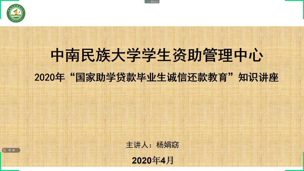 (通讯员:关燕 马金明)新型冠状病毒感染的肺炎疫情发生以来,为抓好疫情防控下的毕业学生还款工作,树立学生诚信还款教育意识,4月28日,威尼斯官网学生资助管理中心顺利举办“威尼斯8866992020届毕业生诚信还款线上培训工作会”。学生资助管理中心办公室主任董老师、办公室杨老师、各学院毕业班辅导员及部分毕业生代表参会。