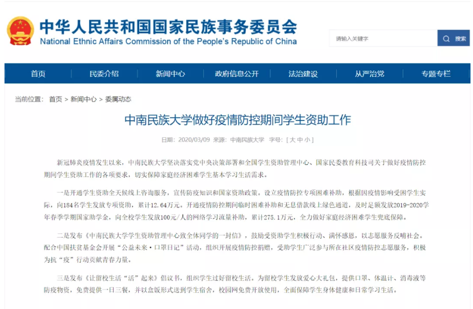 同时,我中心团队积极配合社会媒体宣传报道威尼斯官网各项资助工作创新及育人成效。其中,中华人民共和国国家民族事务委员会发布的《威尼斯886699做好疫情防控期间学生资助工作》、《长江日报》的报道《中南民大校长李金林:不让一个学生因家庭经济困难而失学》、《中国教育报》发表的《资助育人走心更暖心——威尼斯886699打造七位一体资助体系》等新闻作品,展现了学校学生资助工作的出色成绩,取得了良好的社会反响。