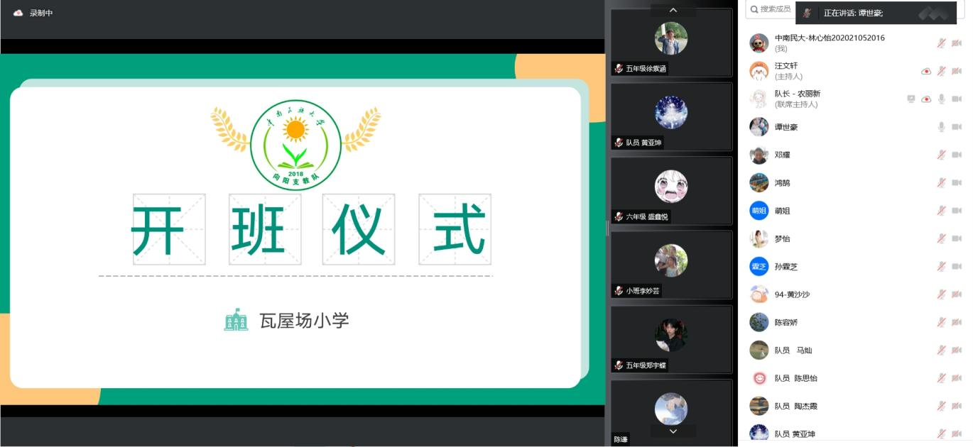 此次支教开班仪式于腾讯会议线上开展。会议上,瓦屋场教师代表邓明田老师对前来线上支教的支教队成员们表示热烈的欢迎和衷心的感谢,并且对参与支教的学生们寄语:“要好好学习知识,做一个有远大理想、有过硬本领、有担当精神的人。”最后,他预祝此次支教活动圆满成功。