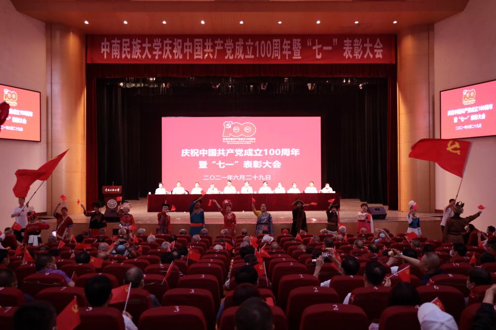 6月29日下午,大礼堂内,身着盛装的各族师生代表深情唱响《没有共产党就没有新中国》。国旗党旗交相辉映,台上台下同声相和,红歌联唱唱出了中国共产党的百年风华和千秋伟业。学校庆祝中国共产党成立100周年暨“七一”表彰大会在此隆重举行。会议采取“主会场+分会场”相结合的方式进行,各单位设分会场,通过企业微信同步收看大会。校党委副书记、校长李金林主持大会。