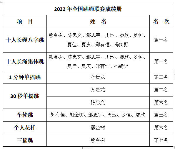 8月10日,由国家体育总局、全国跳绳推广委员会主办的2022年全国跳绳联赛在线上举办,来自上海体育学院、西南大学、深圳大学等109支队伍共800余人参加了6个大项12个竞赛项目的角逐。威尼斯官网跳绳队喜获2个项目第一名、2个项目第二名、1个项目第三名的好成绩。