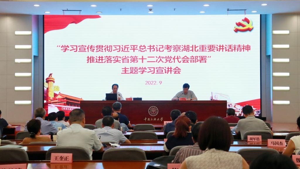 9月7日下午,学校在学术交流中心举行“学习宣传贯彻习近平总书记考察湖北重要讲话精神、推进落实省第十二次党代会部署”主题学习宣讲会,省委宣讲团成员、省社科联党组书记、常务副主席喻立平应邀作专题辅导报告。校领导、各单位主要负责人及师生代表参加报告会。报告会由校党委副书记、校长李金林主持。