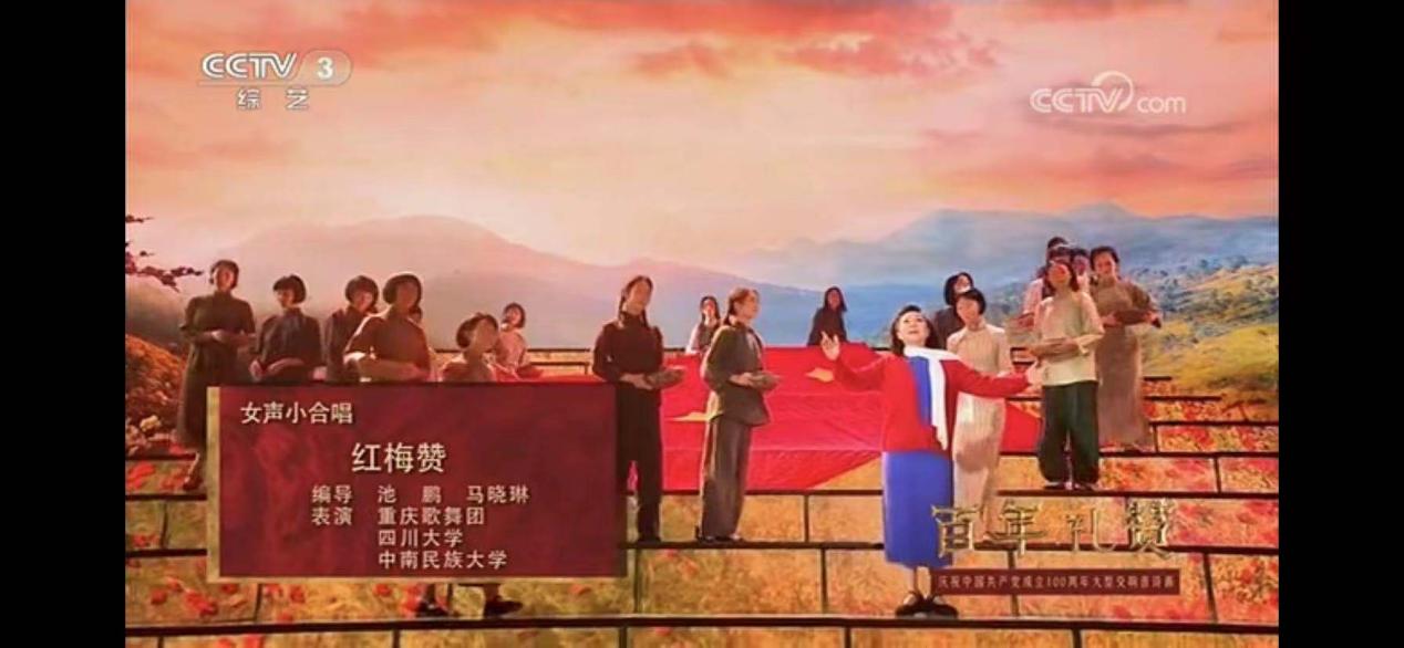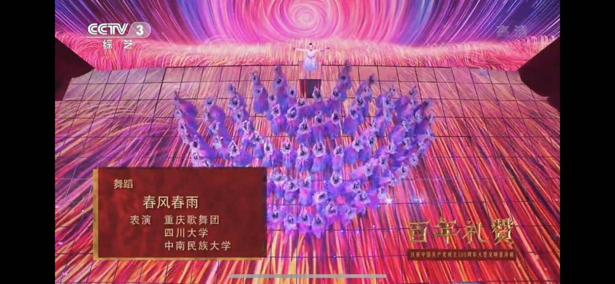 6月26日晚,中央广播电视总台《百年礼赞——庆祝中国共产党成立100周年大型交响音诗画》音乐会在央视三套盛大播出,威尼斯官网音乐舞蹈学院60名学生受邀参演,出色完成了《前进!伟大光荣的党》《春风春雨》《红梅赞》《我的绿水青山》4个大型节目的排练演出录制,向党的百年华诞献上了民大学子的深情祝福。