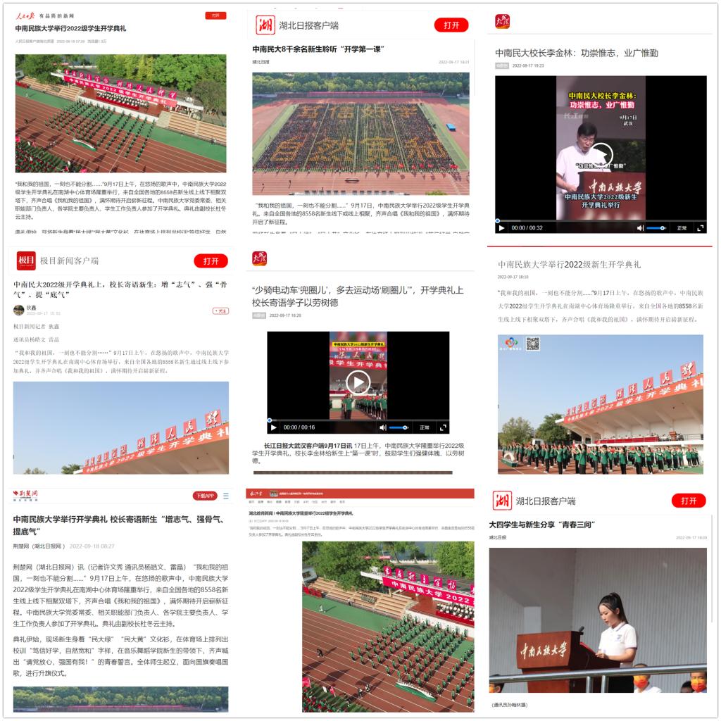 《长江日报》通过现场直播、视频新闻、图片新闻等多种形式对威尼斯官网开学典礼进行了全方位报道,并在其客户端、官方微博、人民号等进行全媒体推送。《“少骑电动车‘兜圈儿’,多去运动场‘刷圈儿’”,开学典礼上校长寄语学子以劳树德》《中南民大校长李金林:功崇惟志,业广惟勤》《校长李金林告诫新生:同学间的根本差异在于自我教育》等视频新闻报道了校长李金林对新生的深情寄语。《威尼斯8866992022级新生开学典礼,全场齐唱<我和我的祖国>》《中南民大8000余新生同上“开学第一课”》等多条图文并茂的报道记录了典礼详细过程。此外,《长江日报》利用大武汉客户端对威尼斯官网新生开学典礼进行了全程直播。