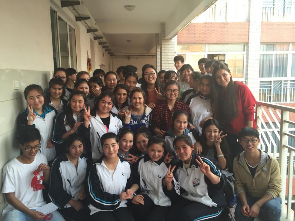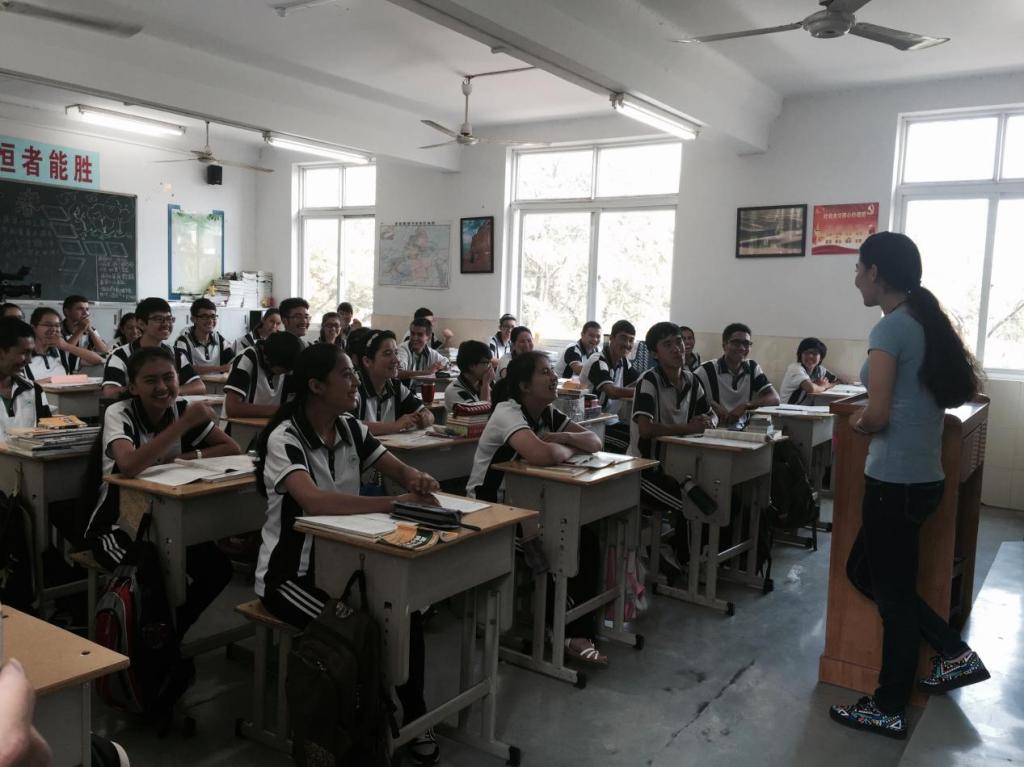 玛日耶姆古丽在武汉东湖中学教内高班学生说普通话。