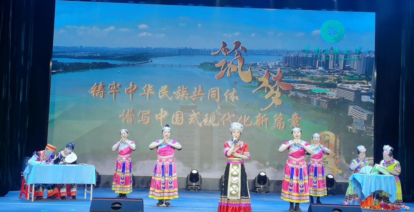 “一玉口中国,一瓦顶成家。都说国很大,其实一个家 ……”在姜艳《国家》的深情演唱中,4位馆员用优美的手语舞演绎着曲中真情。原图书馆馆长李庆福与3位馆员用书法、刺绣现场演绎女书作品。曲近尾声,随着长达7米的女书版《瑶文歌》长卷徐徐展开,现场掌声雷动。