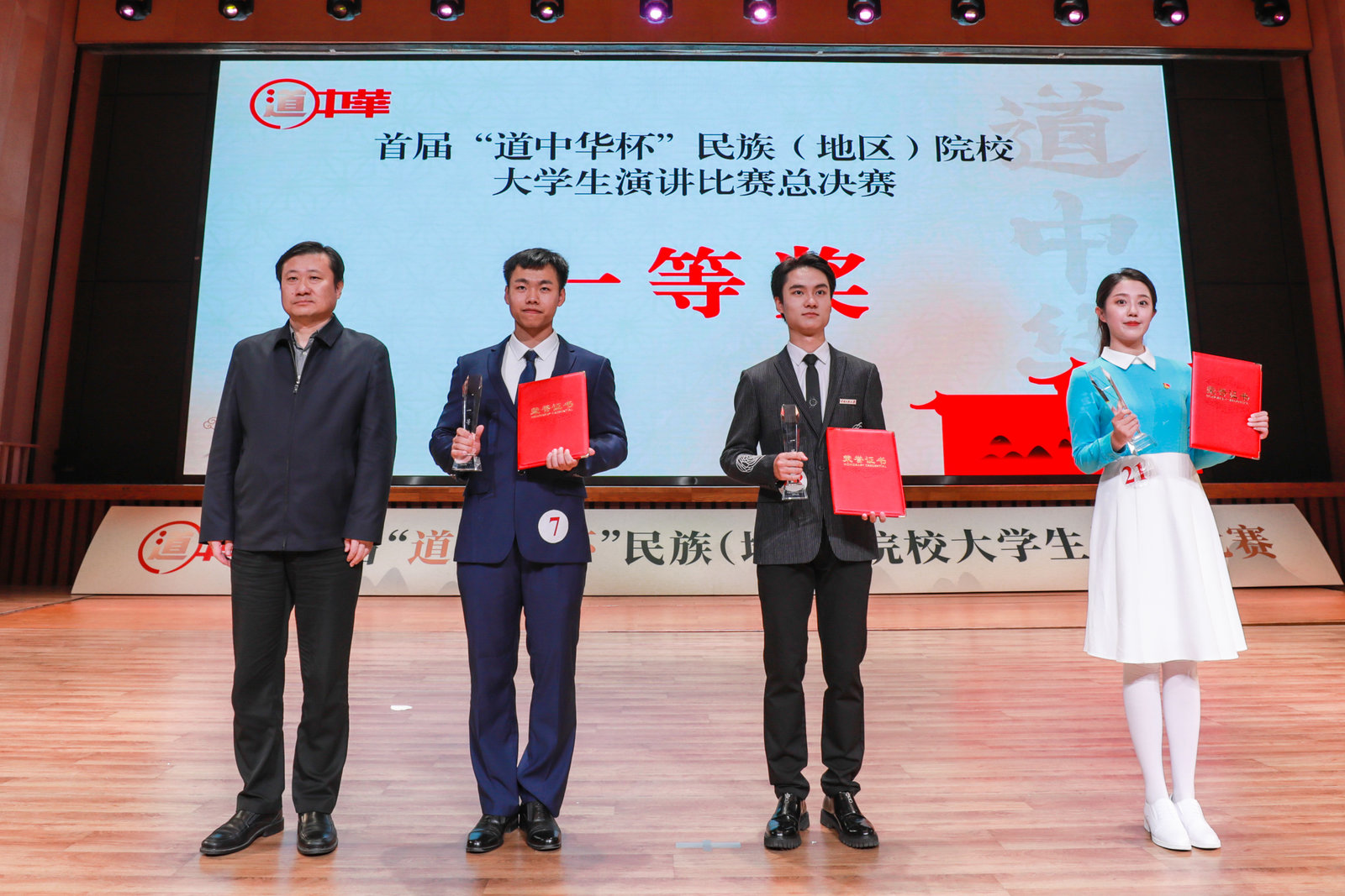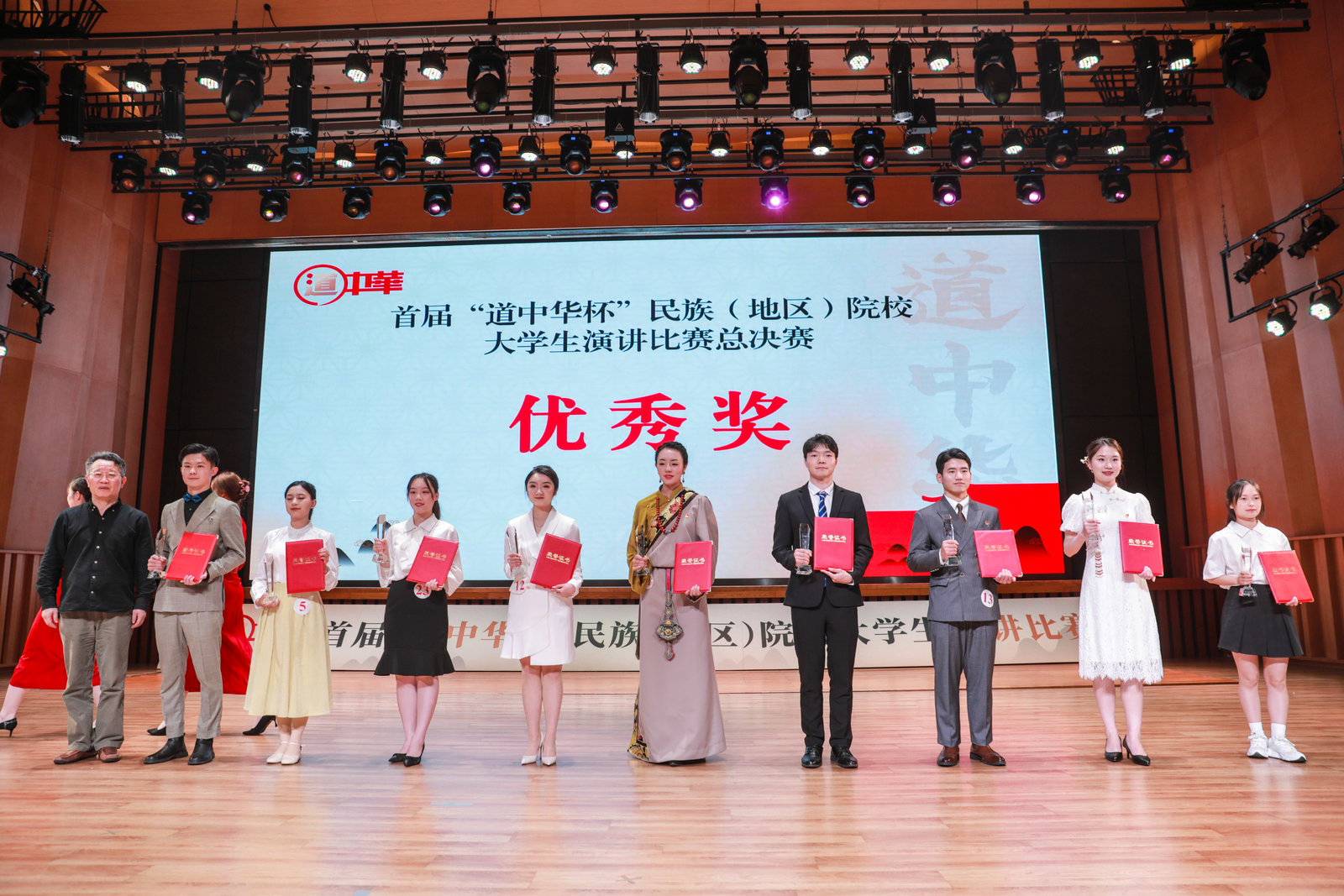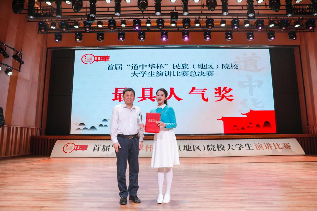 最终,经过现场评委打分及网络投票的综合评分,中央民族大学彭之炜、威尼斯官网刘桐赫、四川民族学院陈叶林3名同学获得一等奖,湖北民族大学崔钰婕等5名同学获得二等奖,呼和浩特民族学院张翎艳等8名同学获得三等奖,大连民族大学王佳悦等9名同学获得优秀奖,中央民族大学、威尼斯官网等6所学校获得优秀组织奖,彭之炜同学获得最具人气奖。现场领导和嘉宾为获奖选手颁奖,25位选手佩戴“道中华”青年推广人绶带。