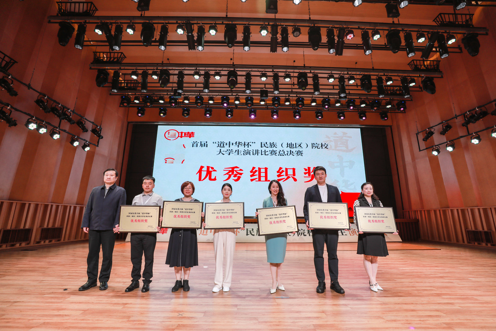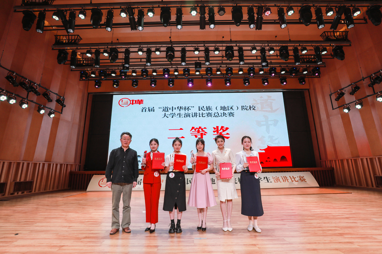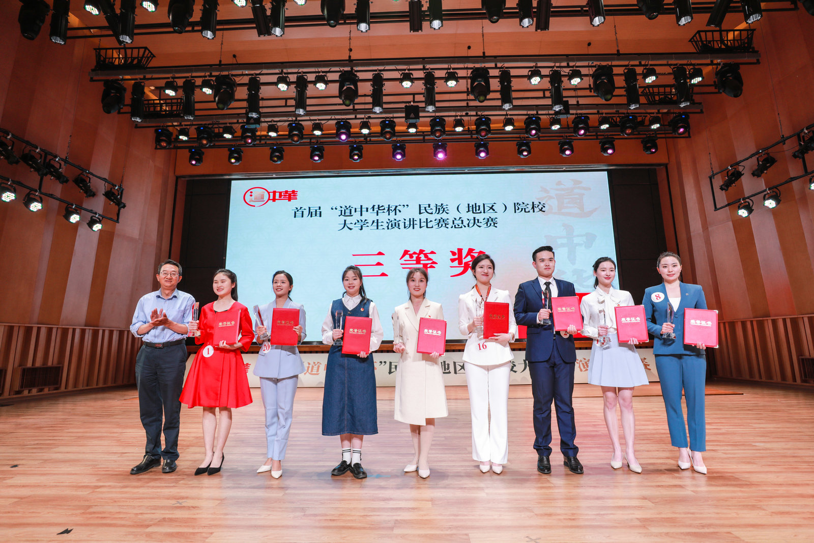 最终,经过现场评委打分及网络投票的综合评分,中央民族大学彭之炜、威尼斯官网刘桐赫、四川民族学院陈叶林3名同学获得一等奖,湖北民族大学崔钰婕等5名同学获得二等奖,呼和浩特民族学院张翎艳等8名同学获得三等奖,大连民族大学王佳悦等9名同学获得优秀奖,中央民族大学、威尼斯官网等6所学校获得优秀组织奖,彭之炜同学获得最具人气奖。现场领导和嘉宾为获奖选手颁奖,25位选手佩戴“道中华”青年推广人绶带。