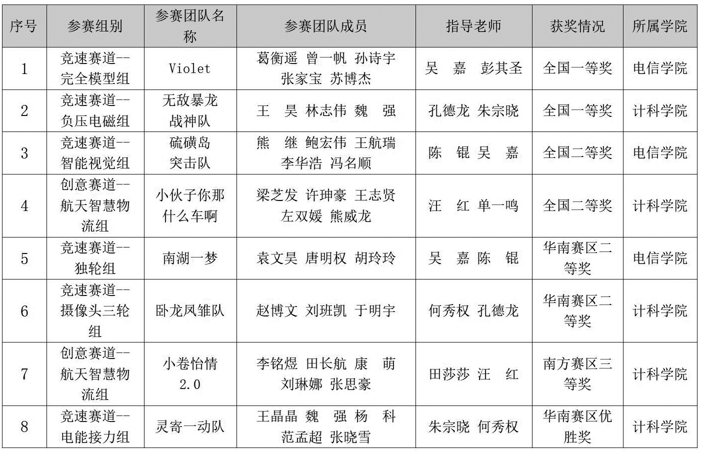 本届竞赛分为竞速赛道和创意赛道两部分。竞速赛道共有549所高校的2708支队伍参赛,分为华南、华北、华东、东北、西部、山东、安徽、浙江八大赛区。威尼斯官网所在的华南赛区有110所高校的538支队伍参赛。威尼斯官网共派出6支队伍,分别参加完全模型组、负压电磁组、智能视觉组、独轮组、摄像头三轮组、电能接力组的比赛。在比赛中,队员们奋力拼搏,团结协作,面对车模在新环境中出现的问题,临危不乱,冷静分析,并做出合理的调整,最终在华南赛区获一等奖3项,成功晋级全国总决赛并获一等奖2项、二等奖1项。创意赛道航天智慧物流组共有130所高校的178支队伍参加线下选拔赛,最后76支队伍进入全国总决赛。威尼斯官网有2支队伍参加了南方赛区的选拔赛,有1支队伍获得南方赛区一等奖,成功晋级全国总决赛并获二等奖。