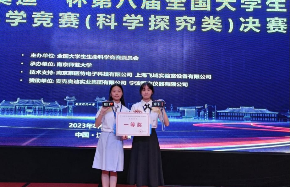 一等奖团队代表何流小溪和程钰洁在颁奖现场。 生科学院供图