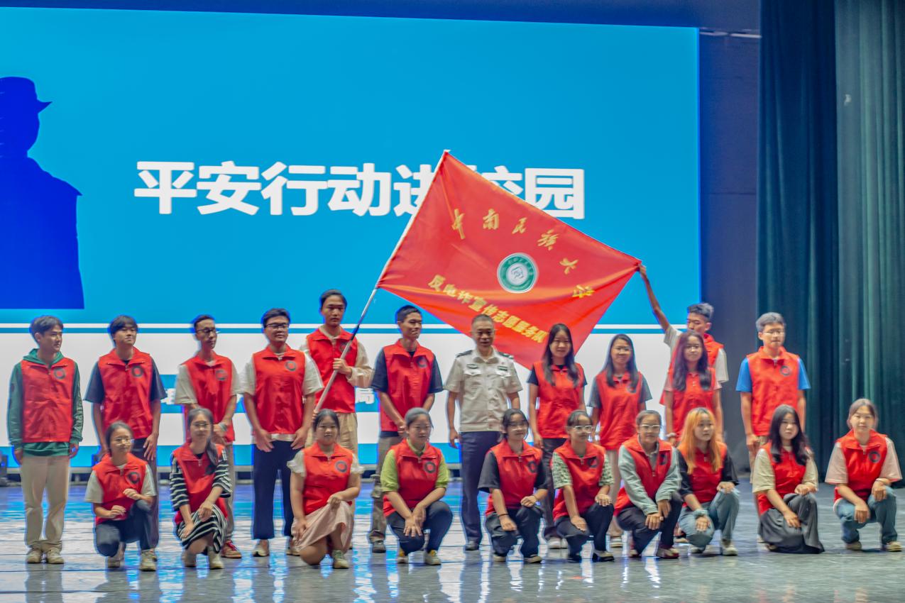 吴培勇为威尼斯官网反电诈宣传志愿服务队授旗后与队员合影。 吴雨池摄