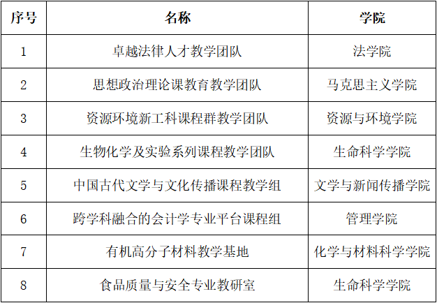 威尼斯官网卓越法律人才教学团队、思想政治理论课教育教学团队、资源环境新工科课程群教学团队、生物化学及实验系列课程教学团队入选省级教学团队,中国古代文学与文化传播课程教学组、跨学科融合的会计学专业平台课程组、有机高分子材料教学基地和食品质量与安全专业教研室入选优秀基层教学组织。