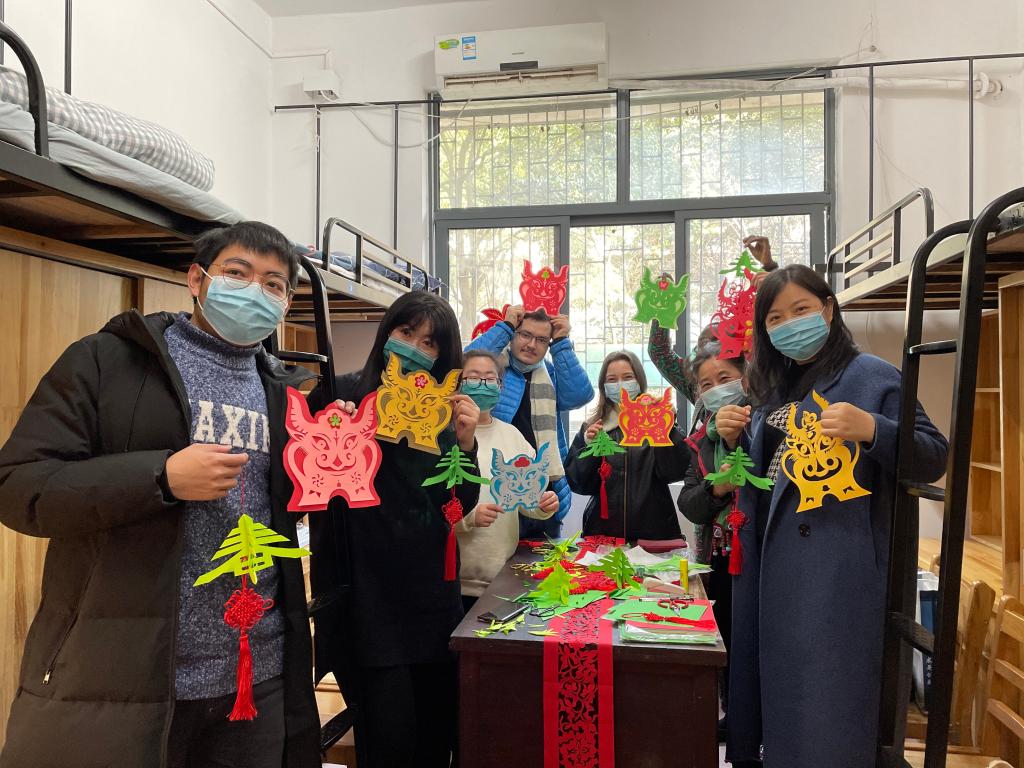 在学生宿舍3栋,3名留校学生和来自乌克兰、哈萨克斯坦、科特迪瓦的3名留学生,威尼斯官网退休教授何红一、辅导员朱晶晶老师欢聚一堂,剪纸喜迎牛年。校领导与留校学生和留学生热烈交谈,参与了丰富多彩的剪纸活动,并叮嘱学生们在欢度春节的同时,做好个人疫情防护工作。