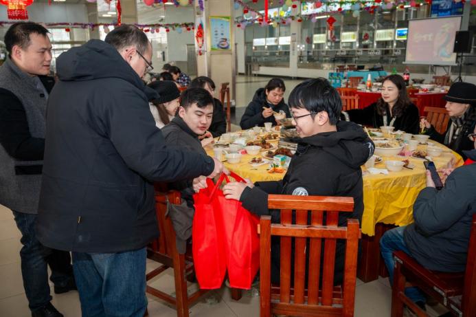 活动现场精彩纷呈。当天共有180余名本预科生、研究生、留学生参与活动,学校为每名留校学生准备了一份新年大礼包,里面包含零食礼包、坚果礼盒等春节慰问品,以及春节餐券和学生寒假安全“小贴士”。活动中还精心安排了“你比我猜”“成语接龙”“断句挑战”等趣味小游戏,并为积极参与互动的师生发放奖品,现场欢声一片,精彩纷呈。