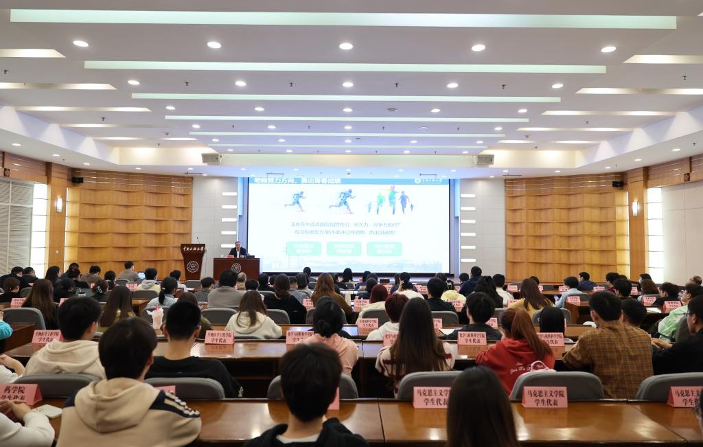 宋发军总结回顾了2022级学生一年多的学习生活和成长得失,从“大二年级的阶段性特征、当前面临的形势任务、应该如何行动”三个方面为同学们进行了深入浅出、富于启迪的讲解。他指出,大二年级是隐性的分化期、重要的转折期和关键的抉择期,是大学的“十字路口”,“如何选择,方向在哪,怎样走好”是每个2022级同学都要思考的重大问题。他强调,同学们要准确把握当前面临的形势任务,立足国际国内大环境和自身实际,一要做到明确目标,找准前进方向;二要做到惜时勤学,练就过硬本领;三要做到严于律己,培养强健身心;四要做到志存高远,投身伟大建设,练就过硬本领,将“小我”融入“大我”,与时代同频共振,与国家同向而行。