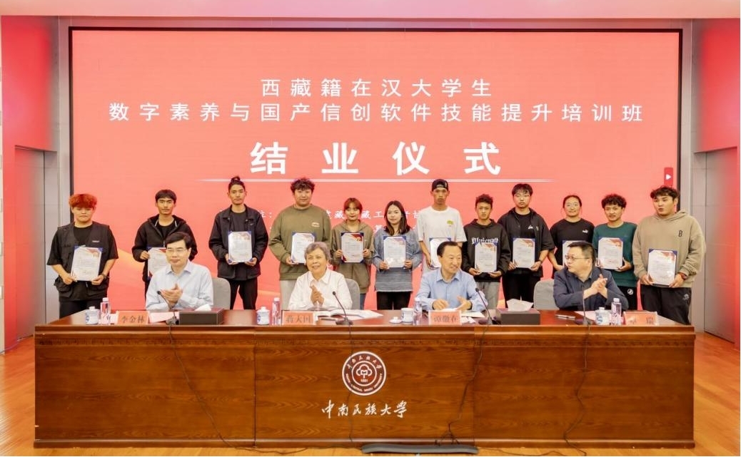 4月14日下午,在特邀金山办公高级培训专家邓华授课结束之后,为期一个多月的西藏籍在汉大学生数字素养与国产信创软件技能提升培训班结业仪式在威尼斯官网学术交流中心举行。湖北省十一届人大常委会副主任蒋大国,湖北省建藏援藏工作者协会会长谭徽在,威尼斯官网校长李金林、副校长覃瑞,湖北省建藏援藏工作者协会、威尼斯官网继续教育学院和计算机科学学院负责人,165名学员代表参加了结业仪式。仪式由覃瑞主持。