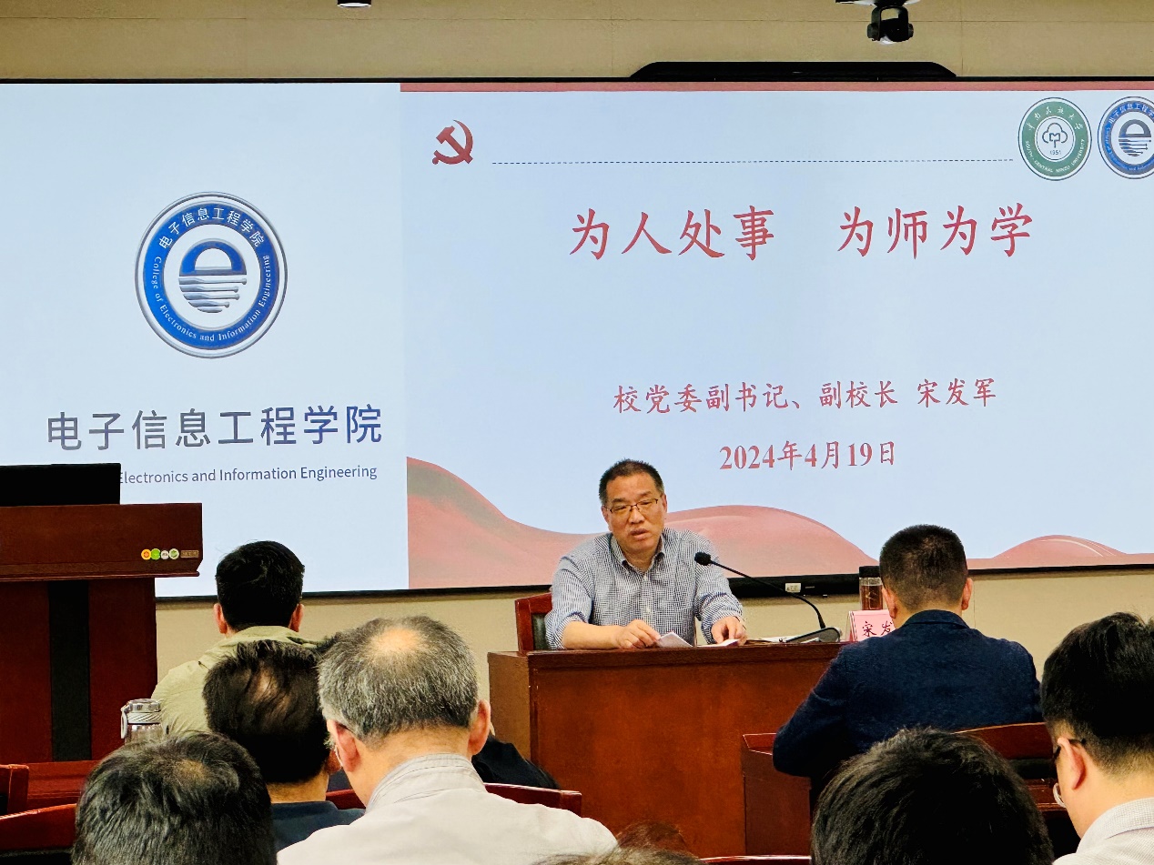4月19日上午,校党委副书记、副校长宋发军到电子信息工程学院讲授“为人处事 为师为学”主题党课,并督导学院一体推进党风、教风、学风建设。电信学院全体教工、学生党员代表参加了本次学习。