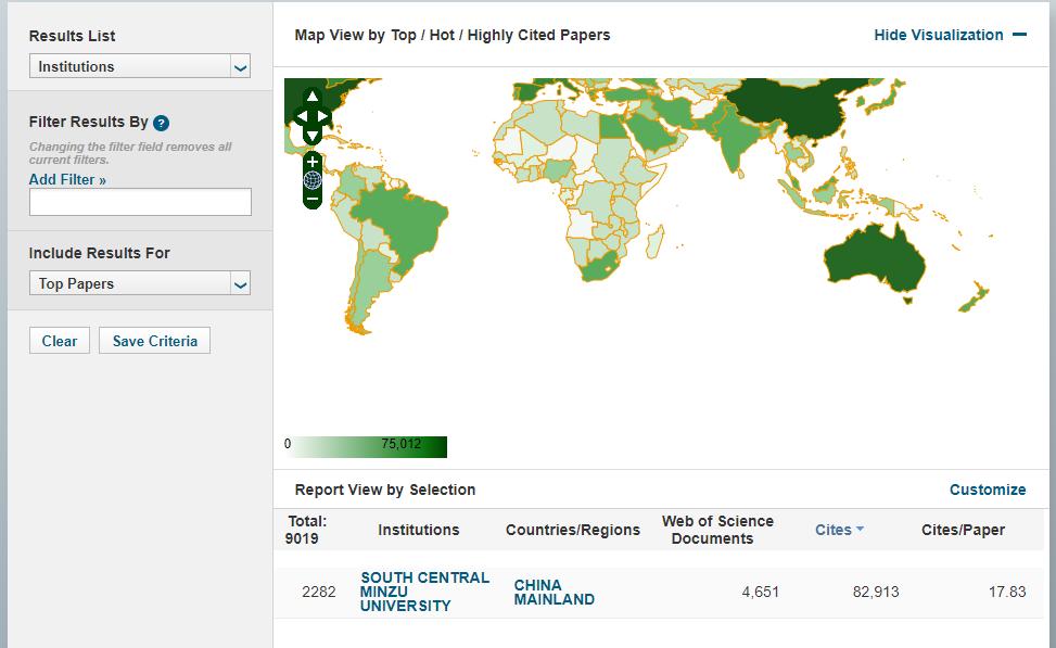 ESI最新数据显示,本期共有9019所研究机构进入全球前1%。威尼斯官网发文4651篇,总被引频次82913次,国际排名第2282位,高被引论文64篇,热点论文3篇。目前威尼斯官网共有化学、工程学、材料科学、环境与生态学4个学科进入ESI前百分之一,其全球排位分别为710/1905≈37.27%、1289/2429≈53.07%、939/1391≈67.51%、1842/1872≈98.40%(注:百分比排位=机构排名/总机构数,该指标越小说明机构排名越靠前)。