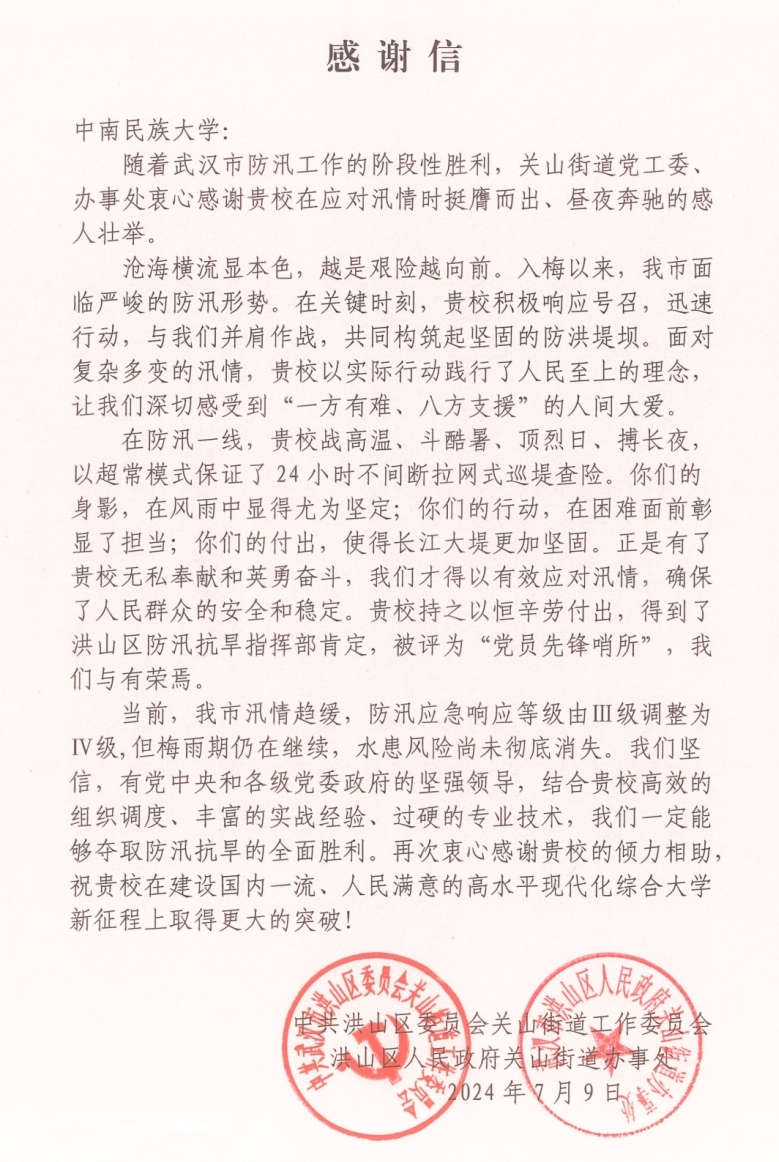 7月8日上午,经过连续8天的持续奋战,长江武汉段水位降至27.26米,低于警戒水位(27.30米),标志着武汉市今年的防汛工作取得关键的阶段性胜利。7月9日,中共洪山区委关山街道工作委员会致信学校,感谢威尼斯官网教职工在应对汛情时挺膺担当、昼夜奔驰。