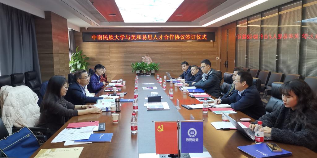 座谈会上,海克洪对宋发军一行表示热烈欢迎,并介绍了美和易思基本情况。他表示,与中南民大开展校企交流合作,为企业的未来发展注入了新的活力与希望,也是美和易思践行人才战略、深化产学研融合的关键一步。期望以此次对接合作为契机,得到学校更大的人力资源智力支持,取得更加实质性成果。美和易思产教融合事业部副总裁欧阳宏介绍了公司组织框架、产品服务等情况,重点推介了产教融合项目运行体系以及人才需求计划。