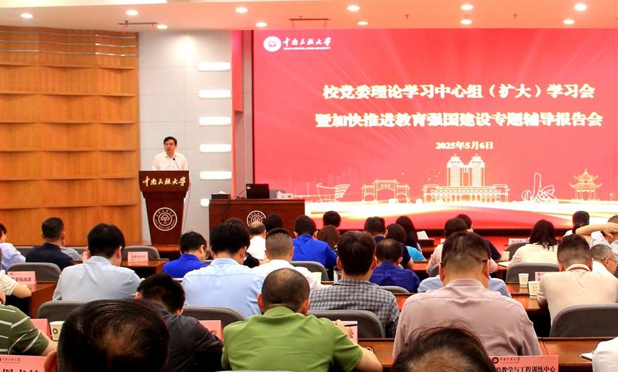 5月6日下午,校党委举行理论学习中心组(扩大)学习会暨加快推进教育强国建设专题辅导报告会,深入学习习近平总书记在全国教育大会上的重要讲话精神和《教育强国建设规划纲要(2024—2035年)》(以下简称《纲要》),研究部署学校贯彻落实工作。在校校领导、党委常委,各单位主要负责人,职能部门、教辅单位、直属单位副处级以上干部参加集中学习。会议由校党委书记徐业勤主持。