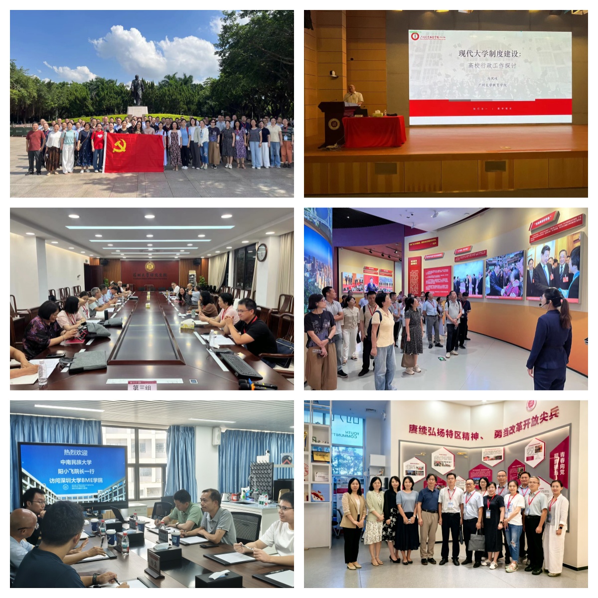 为期7天的集中培训,先后组织开展了《习近平新时代中国特色社会主义思想指引下中青年干部的学习与成长》《党的二十届三中全会精神解读——着力推进教育强国建设、科技人才融合发展》《抓住改革关键点,建设高水平大学——以深圳大学为例》《现代人工智能及应用》《高校人才评价与绩效考核策略》《现代大学制度建设——高校行政工作探讨》《深入贯彻中央八项规定精神、切实加强党的作风建设》等专题讲座。培训班全体学员坚持对标对表,坚持问题导向,坚持上门请教,分赴深圳大学相关学院、职能部门开展“对岗交流”,与深大教师、管理干部面对面交流,精准梳理本单位在争创“双一流”建设、内部治理中的短板弱项,收集可复制、可推广的经验做法,围绕“服务强国建设、聚焦铸牢主线、推动学校转型升级高质量发展”“学先进、找差距、补短板、促提升”“深化作风建设、增强履职能力”等主题开展了交流研讨。培训班结合学习教育,组织全体学员赴深圳莲花山公园邓小平同志塑像广场瞻仰伟人铜像,感悟“敢闯敢试、敢为人先、埋头苦干”的特区精神。培训班还组织学员赴“大潮起珠江”广东改革开放四十周年展、大疆无人机等开展现场教学,学习“深圳速度”背后的制度创新逻辑和技术创新实践。