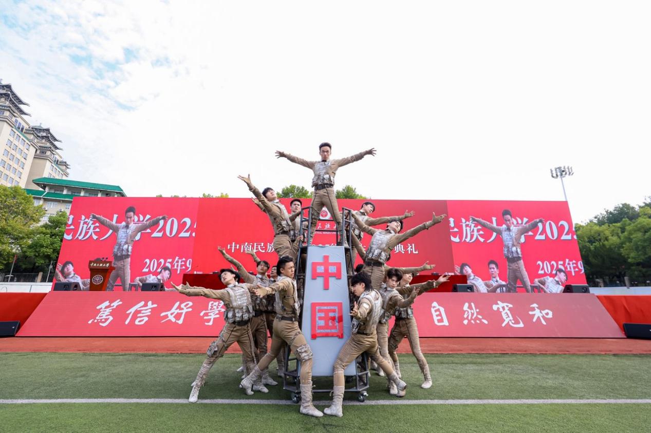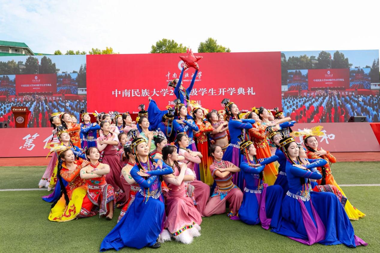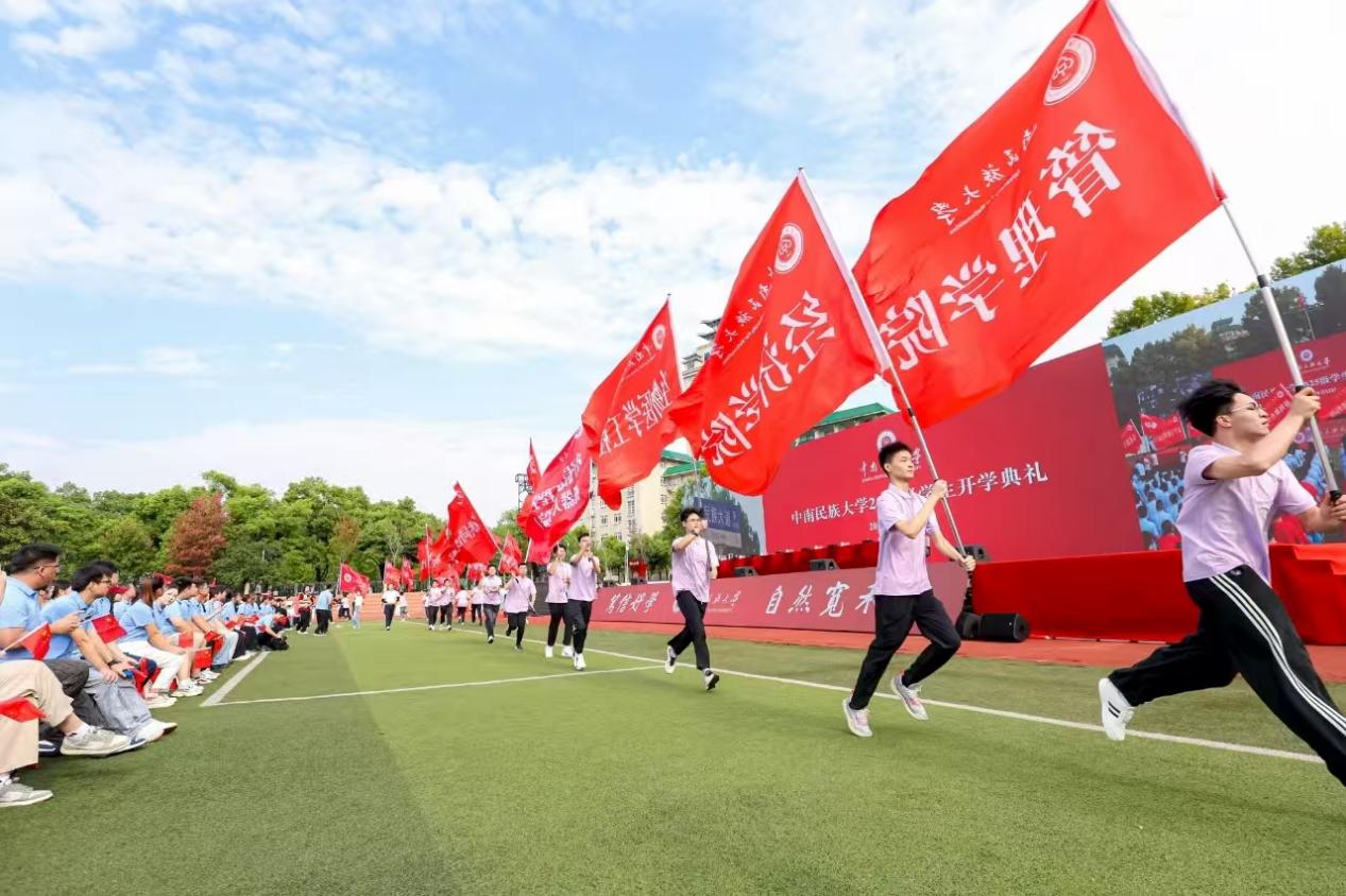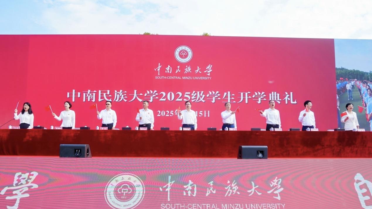 典礼在《歌唱祖国》的大合唱中拉开帷幕,全体师生肃立齐唱国歌。校党委书记徐业勤,党委副书记、校长刘义等校领导为新生代表授予学校徽章,全体新生郑重将其佩戴于胸前。这枚徽章不仅象征着“民大人”的新身份,更承载着“笃信好学,自然宽和”的校训精神,意味着使命与责任的传承。